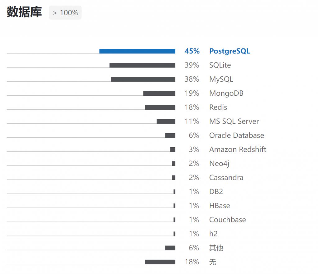 - Node.js流行的后端框架有Express(express-postgres 59,146 express-mysql 33,604)、nestjs(nestjs 39,691 nestjs-mysql 37,529)、fastify(fastify-mysql 83,444 fastify 72,950)等。Go(Gin(gin 95,845))、Rust相对Java(Spring(spring 23,401)),性能更优异,但后端市场份额不大。Python后端框架Django(django-postgresql 15,508)和Flask(flask 10,212)热度相当,FastAPI (fastapi 52,095)发展较为迅速。Ruby on Rails(rails 8,260)关注度似乎越来越低了。